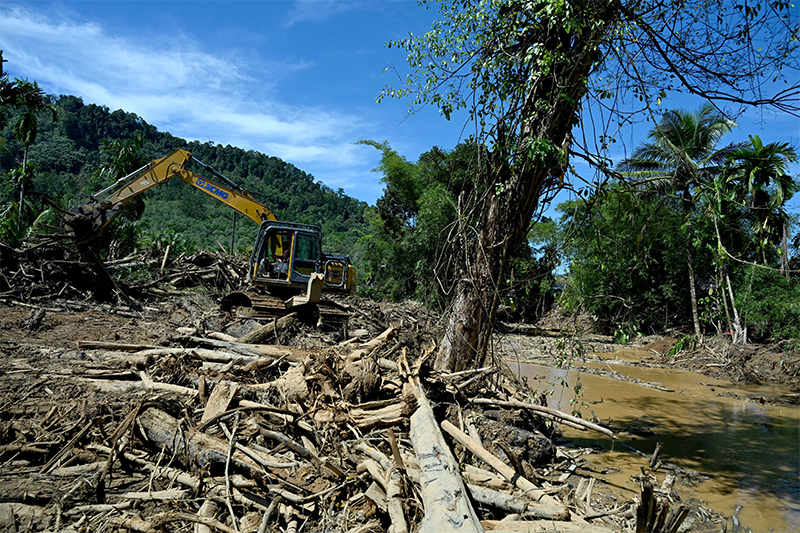 TAPANULI TENGAH, 19/12 - Akses jalan menuju Kecamatan Tukka, Kabupaten Tapanuli Tengah, mulai kembali lancar. Aliran sungai yang sebelumnya tersumbat akibat kayu dan material longsor kini telah dibersihkan sehingga tidak lagi meluap ke badan jalan.