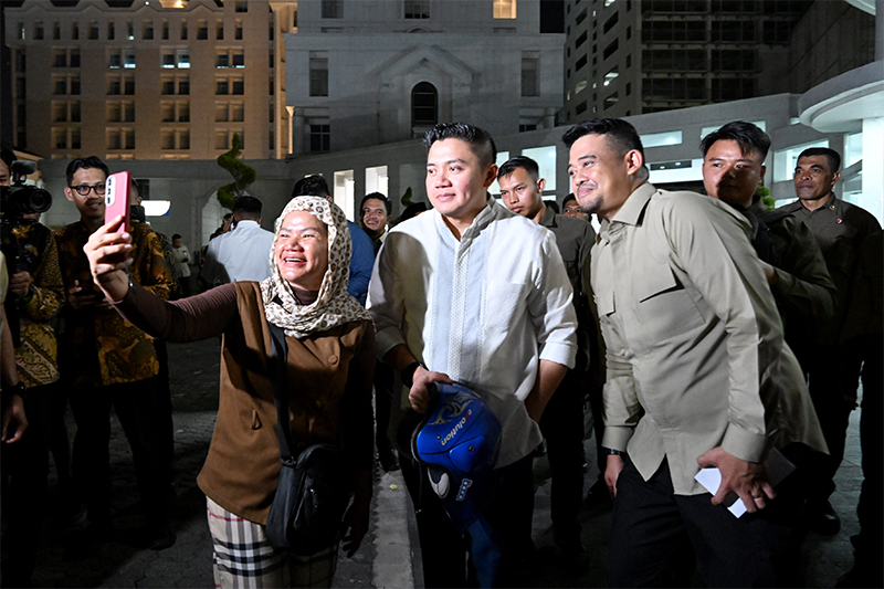 “Jadi kita bagikan tadi paket bingkisan dari Pak Presiden di malam Hari Raya Idulfitri kepada masyarakat, di depan Kantor Gubernur. Saya bersama Menseskab (Teddy Indra Wijaya), ada 2.500 paket bingkisan yang kita bagikan,” ujar Bobby Nasution.