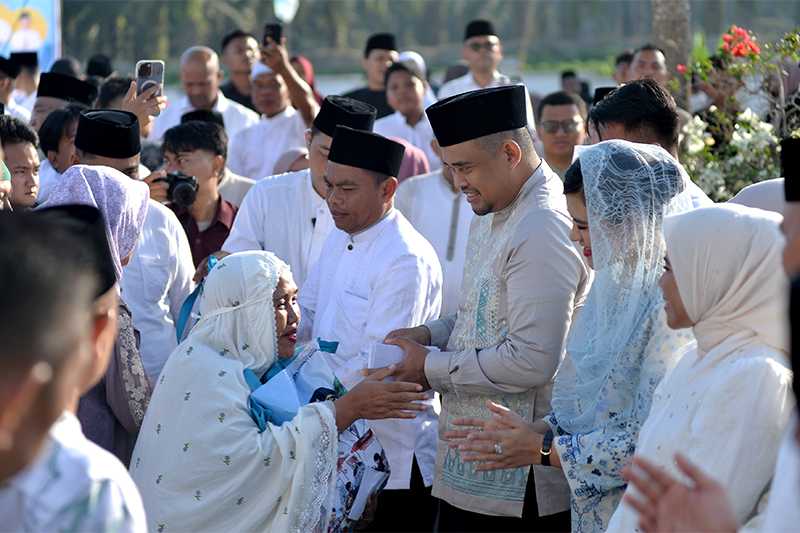 Usai salat, Bobby Nasution didampingi Bupati Sergai bersalaman dengan para jemaah, sembari menyampaikan ucapan selamat Hari Raya Idulfitri kepada masyarakat.